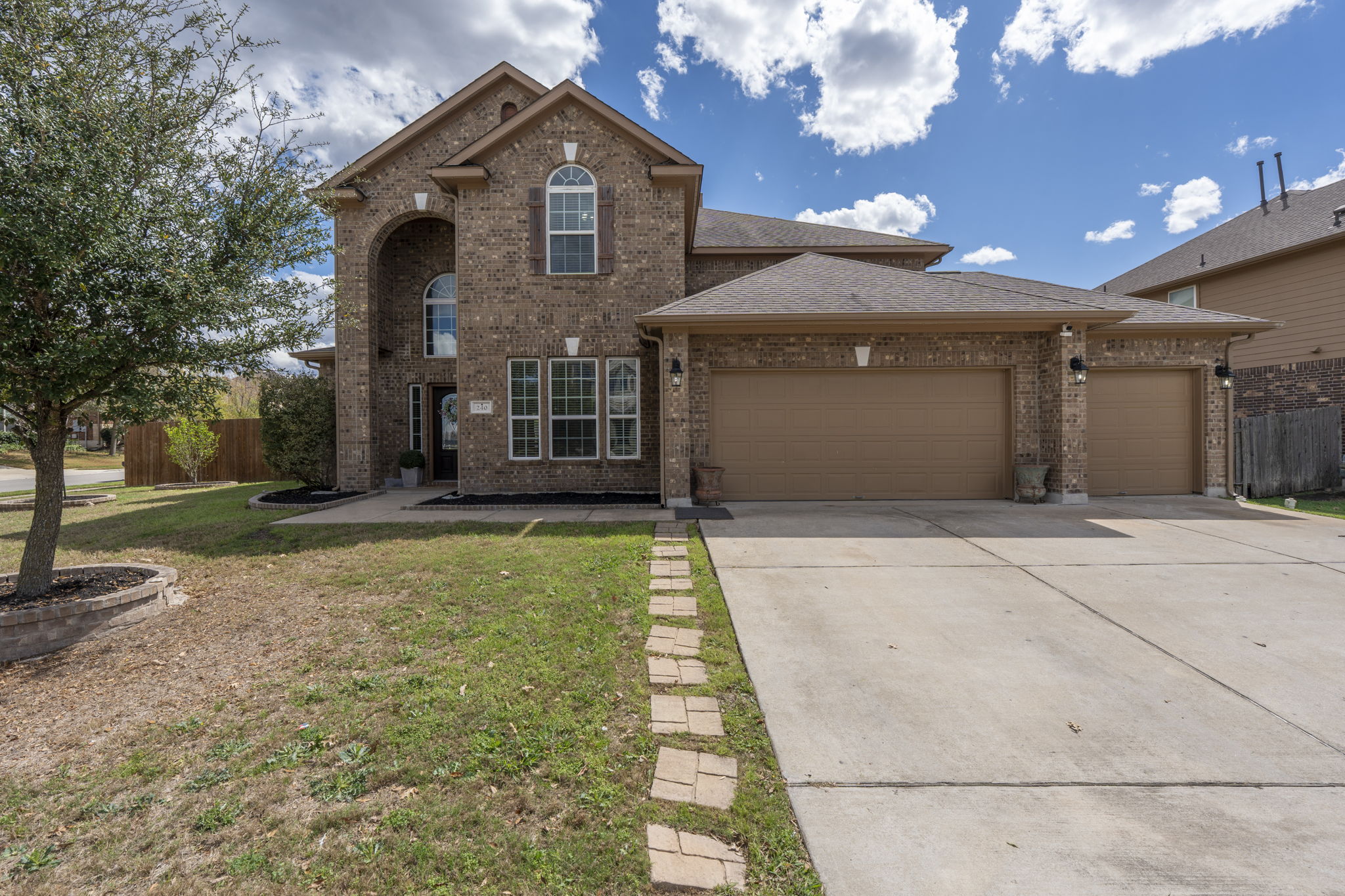 Welcome to 240 Parkrose Drive in the charming community of Buda, Texas—where comfort, space, and outdoor living come together beautifully. This impressive two-story brick home offers exceptional curb appeal with its grand arched entryway, mature landscaping, and spacious three-car garage.